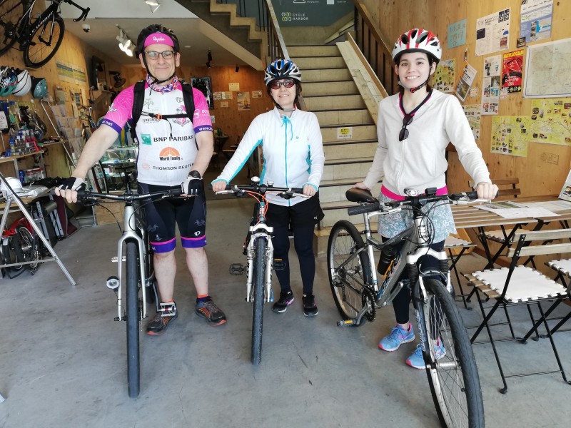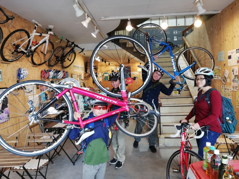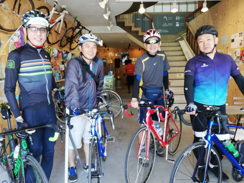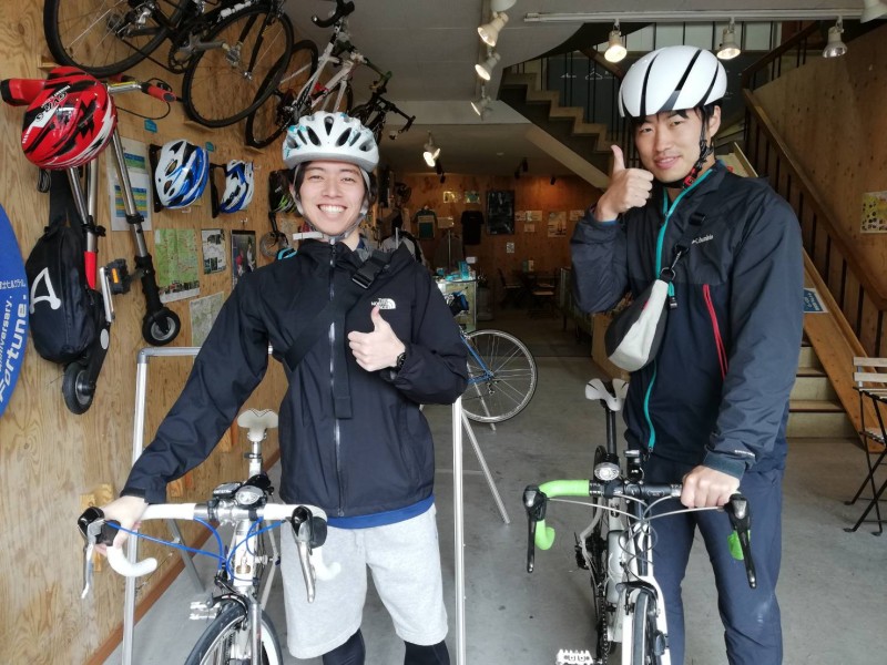 サイクルハーバーを待ち合わせ場所に使って頂きメンバーのお二人は当店レンタサイクルでご出発